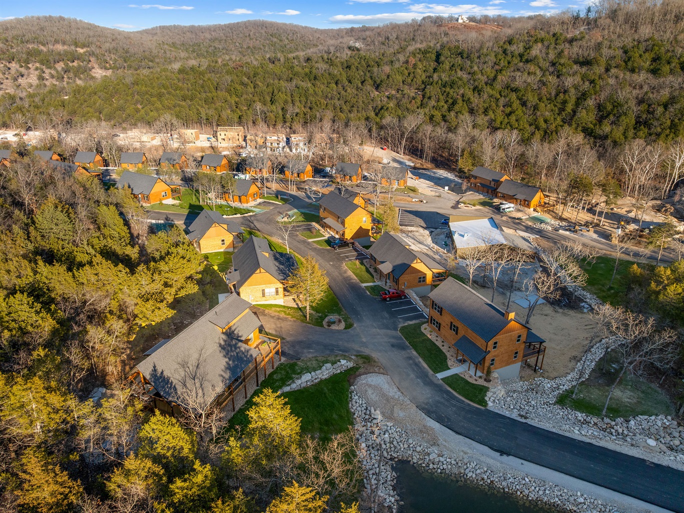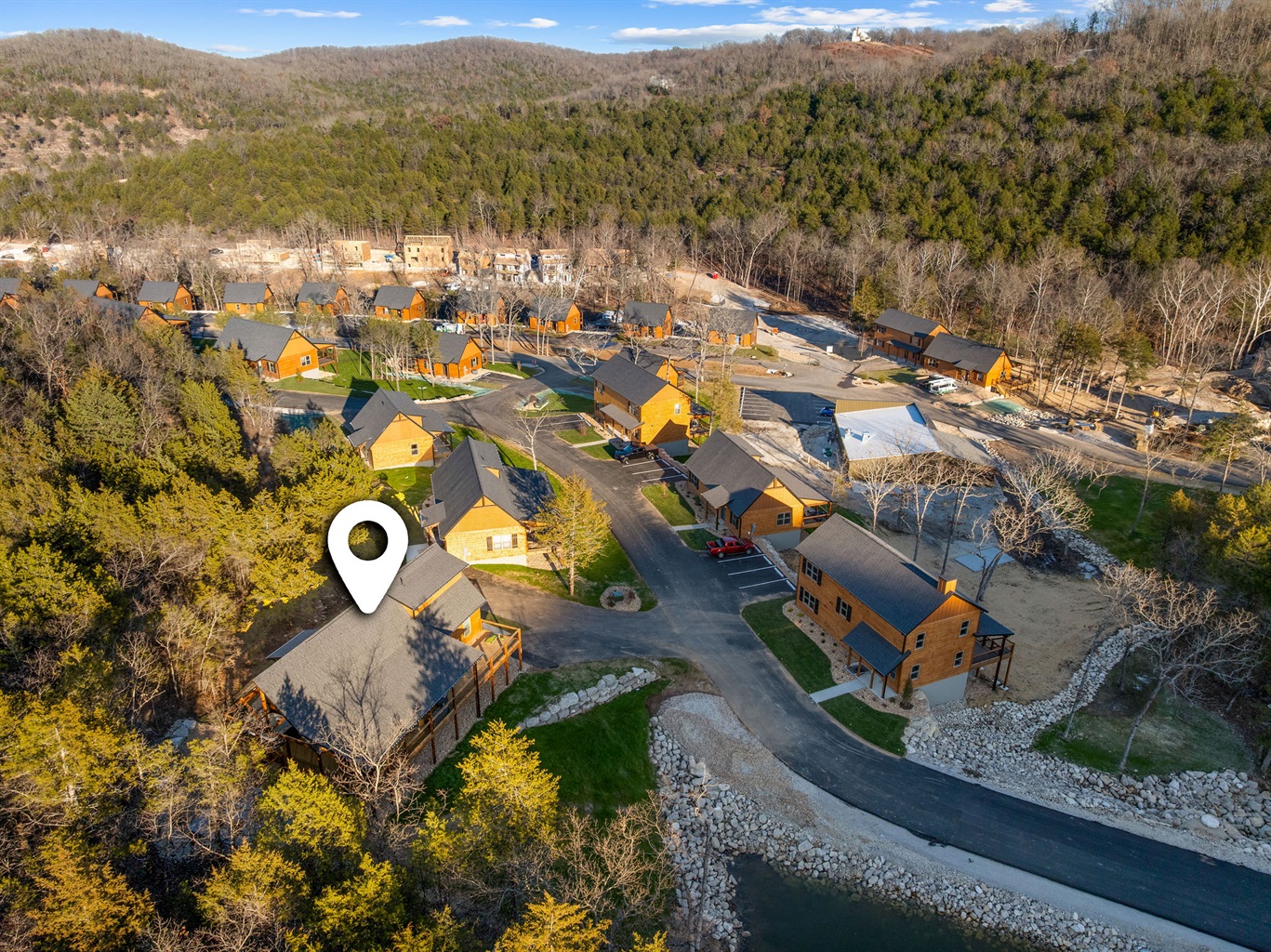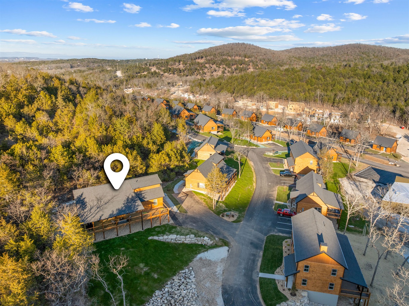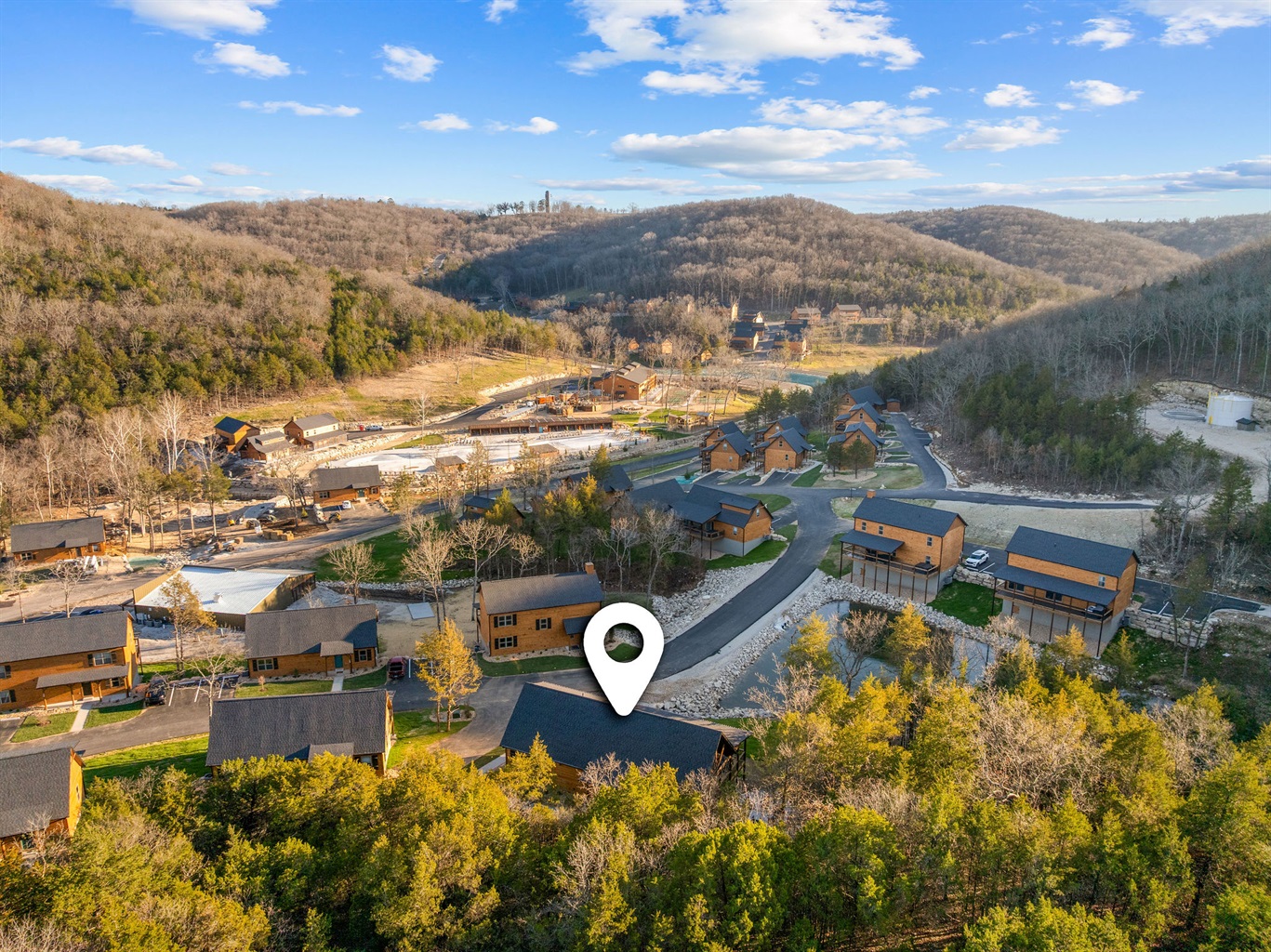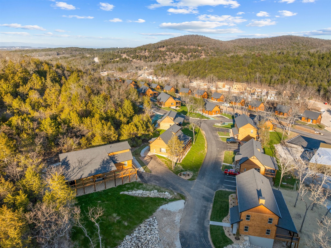 A broader view of the cabin community set among the hills.