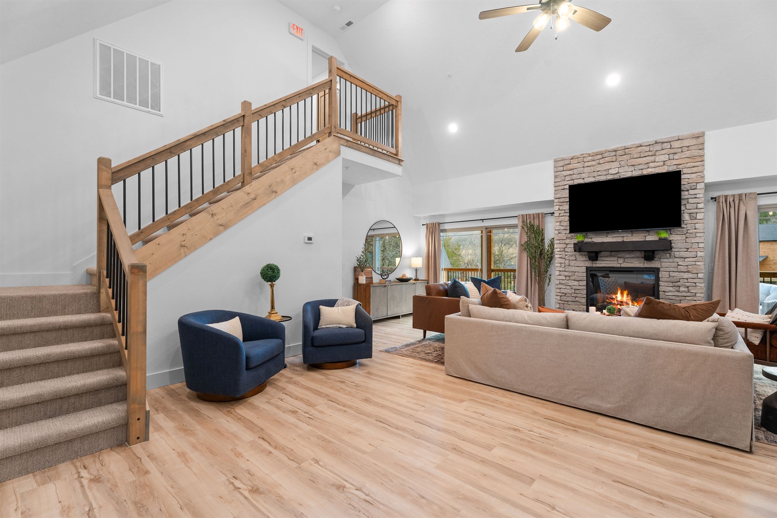 Warm living area with high ceilings and plenty of room to relax.