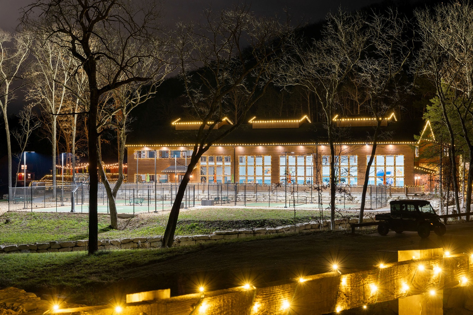 Welcoming exterior with warm lighting as evening sets in.