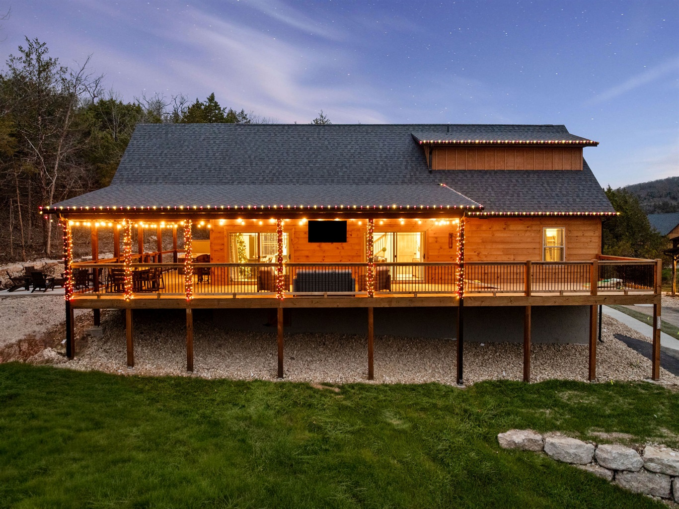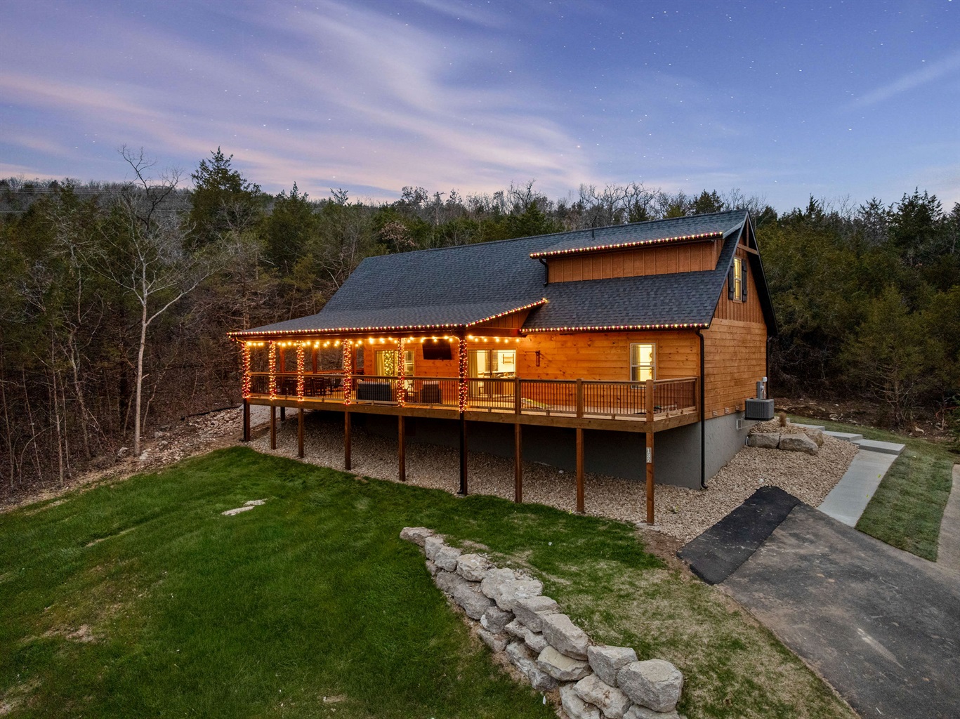 Evening glow highlights the cabin’s large deck and outdoor space.
