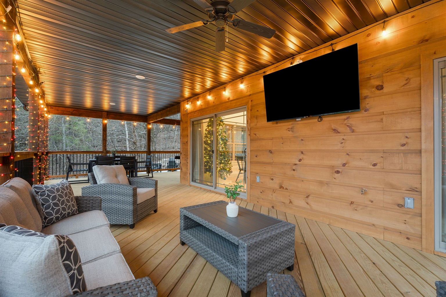Covered deck with string lights for cozy nights outside.