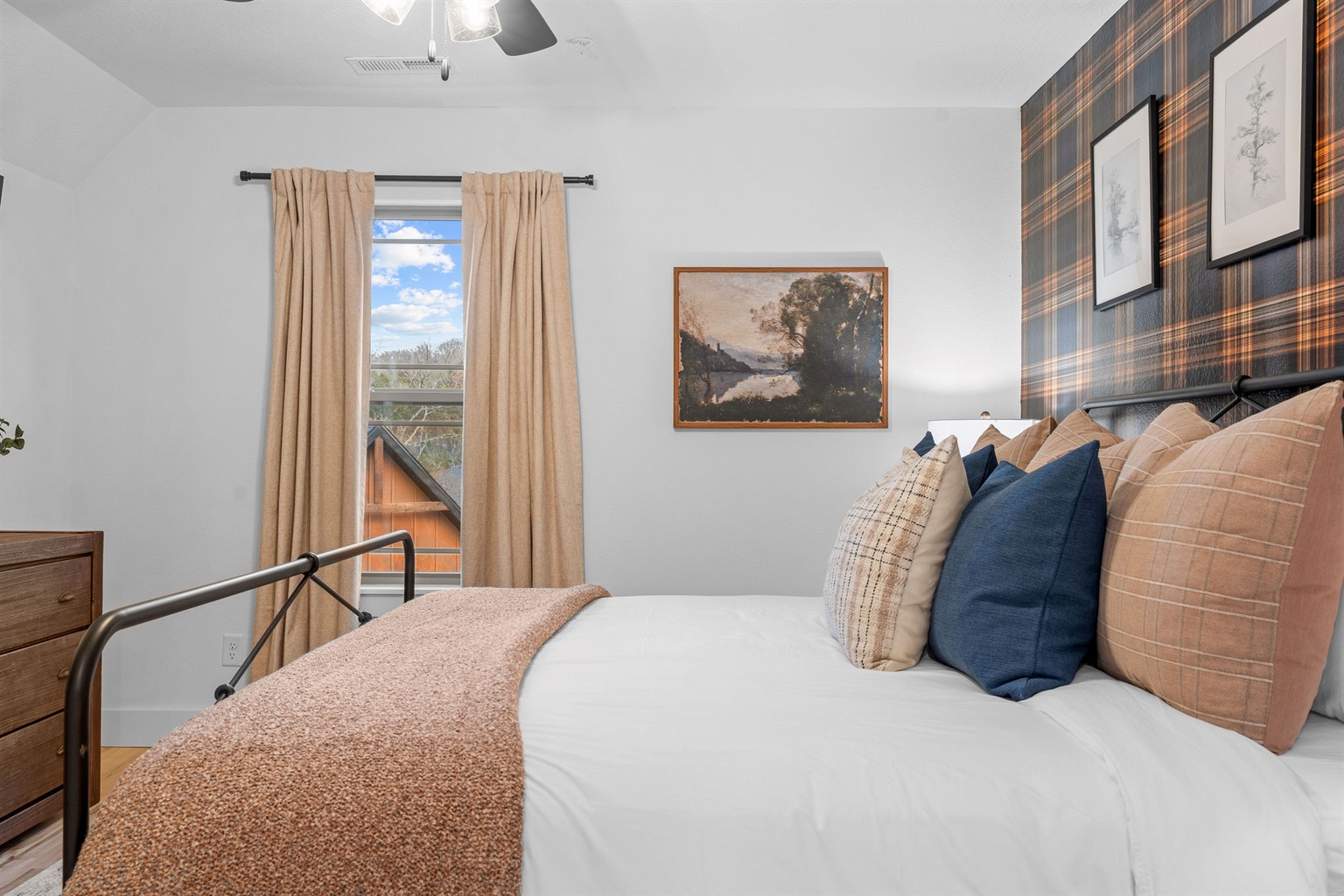 Inviting bedroom with comfy linens and charming decor details.